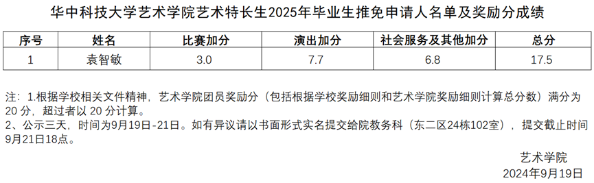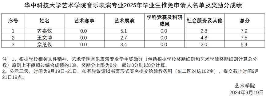 根据公司本科生院《关于做好公司2025年推荐优秀应届本科毕业生免试攻读研究生工作的通知》、《永利3044集团官网2025年音乐表演专业推荐优秀应届本科毕业生免试攻读研究生工作实施办法》、《永利3044集团官网2025年艺术特长生推荐优秀应届本科毕业生免试攻读研究生工作实施办法》的精神,现对2025年推免申请人的奖励分成绩进行公示(见下表)。