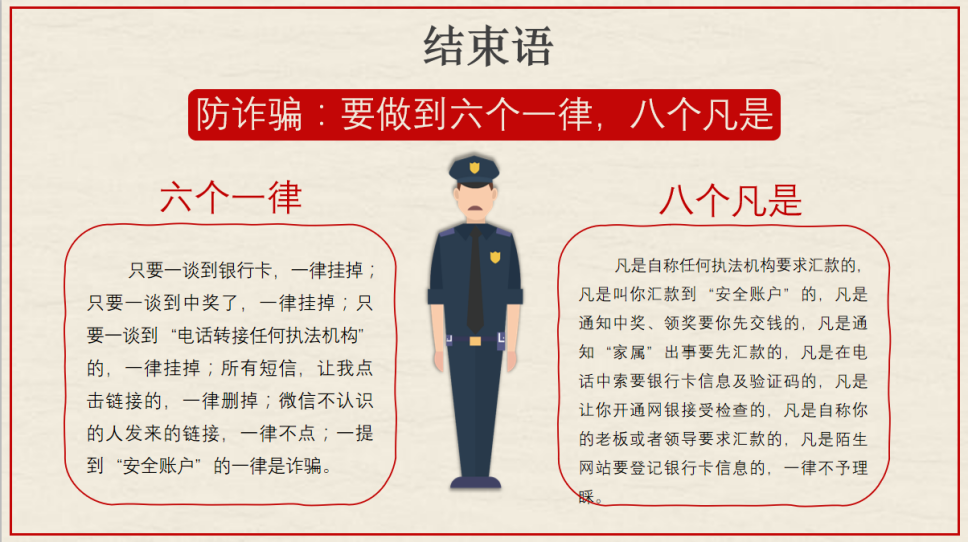 “本次的防诈骗宣传教育很有意义。随着网络的发展越来越快,电信诈骗层出不穷。有冒充公检法、领导、熟人类诈骗;虚假网站、链接类诈骗;还有代办信用卡、贷款类诈骗和冒充客服类诈骗。电信诈骗者往往利用人们趋利避害的心理通过编造虚假电话、短信地毯式地给群众发布虚假信息,在极短的时间内发布范围很广,侵害面很大,所以造成损失的面也很广。我们应该擦亮双眼,甄别这其中的骗术,不要掉进陷阱之中。”